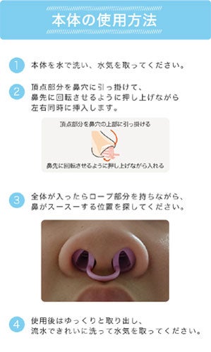 3) 器具の装着が単純。 睡眠時も器具を鼻腔に装着するだけで脱落しない