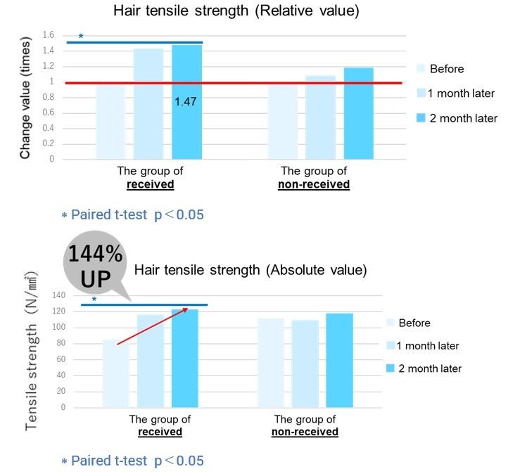 サプリメントを毎日服用した被験者の毛髪引張強度試験では、2か月後では使用前より144%髪の強度が増し、統計的有意に増加した。なお、非服用被験者群と服用被験者群間に統計的有意な差は得られなかった。但し、非服用被験者群において使用前と2か月後に有意な差が得られなかったことから、サプリメントを服用することで毛髪の引張強度が高まった可能性はあると考えられる。