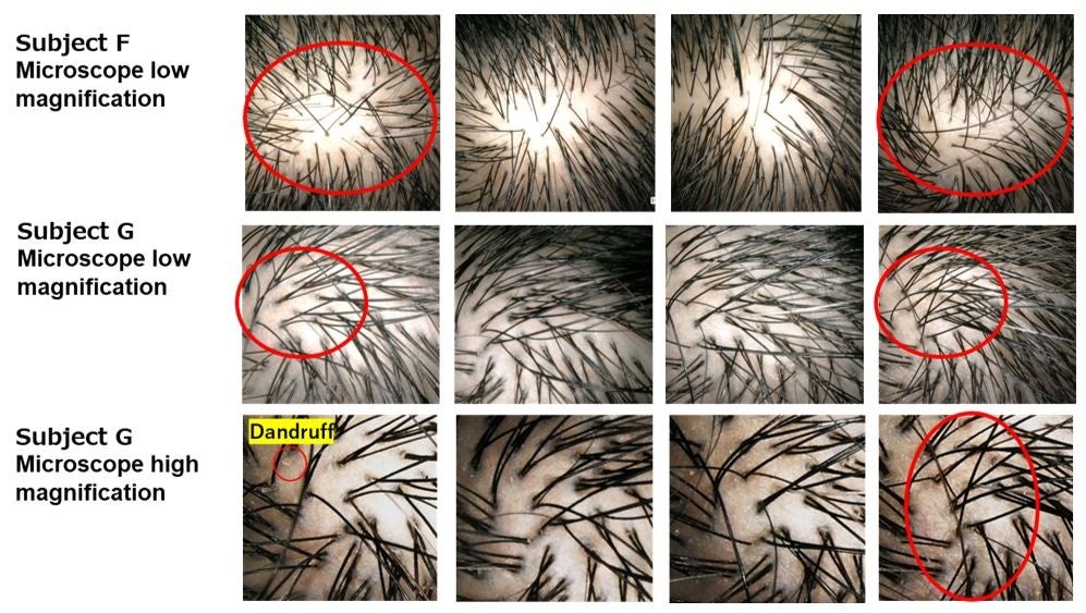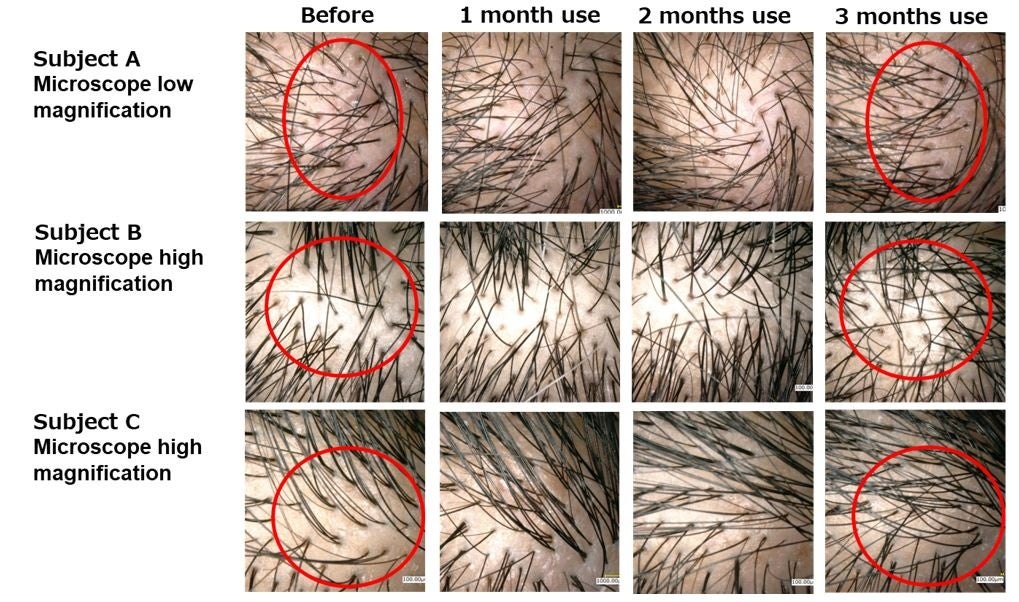 頭頂部を高倍率で観察すると、3か月後使用前より頭頂部の毛の密度が増えたと感じる被験者が6名いた。