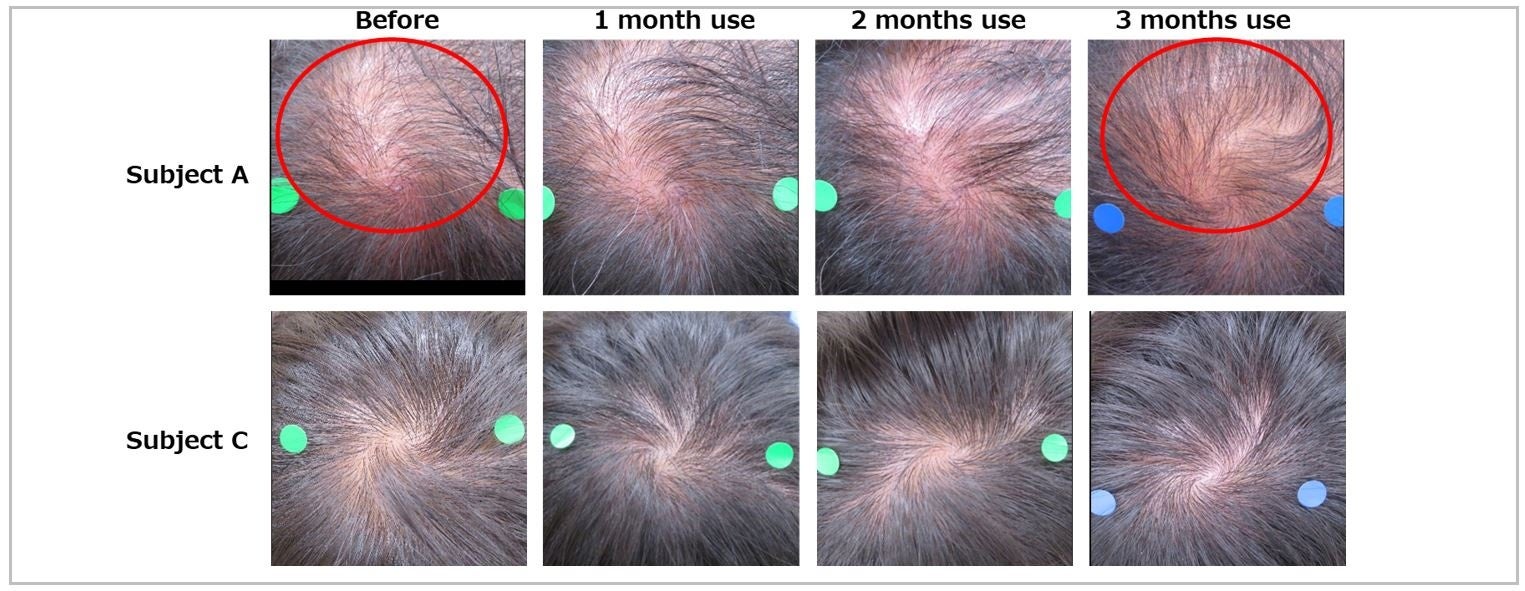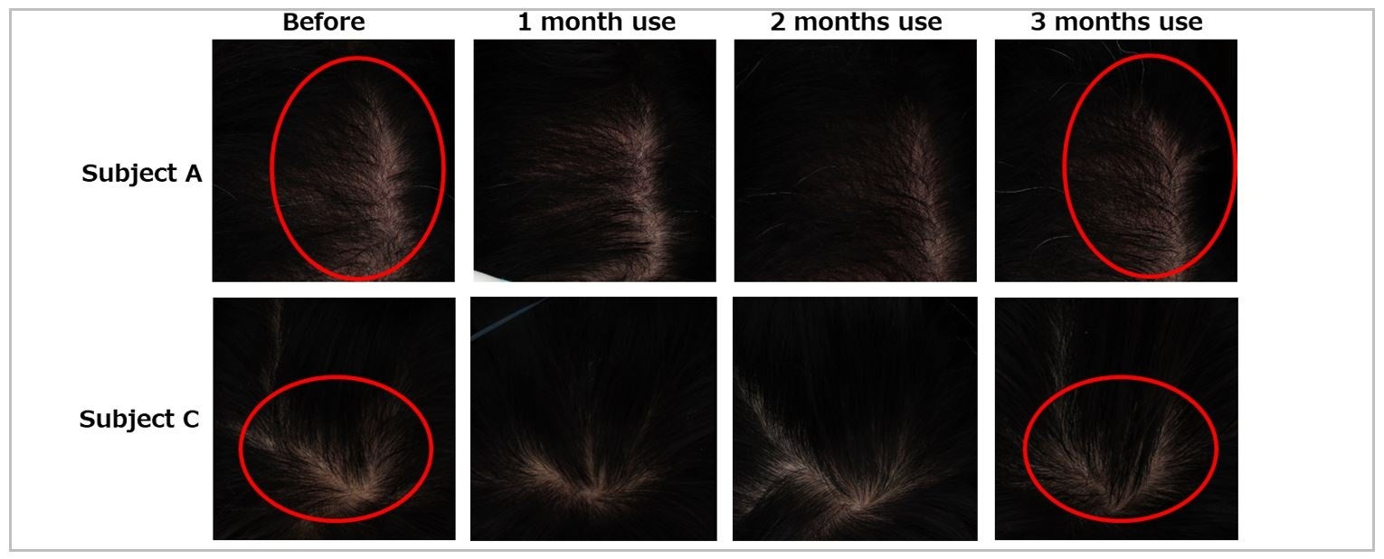 頭頂部を上から撮影すると、3か月後使用前より頭頂部の毛の密度が増えたと感じる被験者が2名いた。