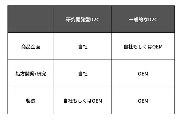 昨今では、様々な化粧品D2Cブランドが誕生していますが、その多くが企画会社に委託したり、化粧品OEMメーカーに研究、開発、製造を委託することで販売されています。研究開発型D2Cコスメブランドとは、研究と開発を自社で行い製造はOEMメーカー様を利用する、もしくは研究と開発、製造まで全て自社で行うことを指します。