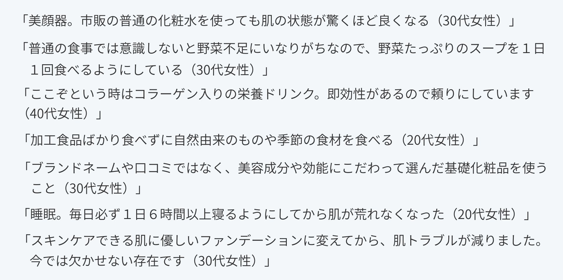 美容に感度の高い女性という括りではありましたが、20〜40代という幅広い年代ということもあり、さまざまな回答がありました(一部抜粋しています)。