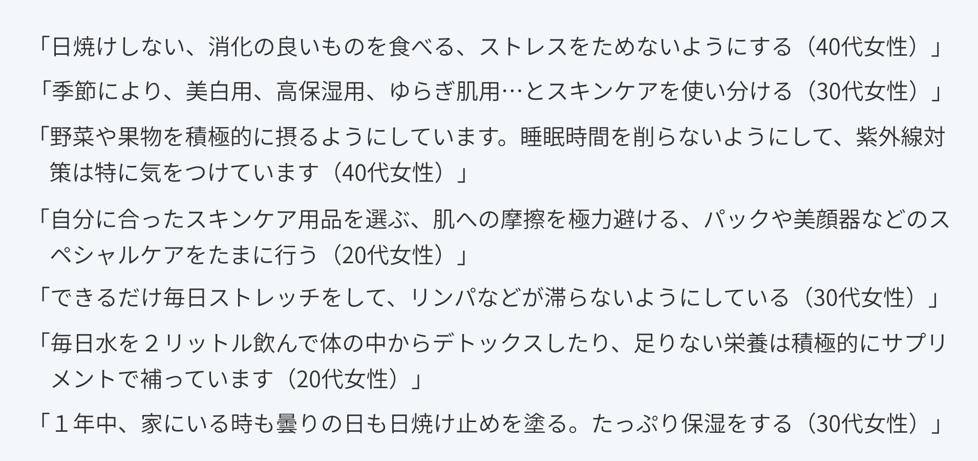 アンケートで「美肌を保つために、日頃から気を付けていること」をお尋ねしたところ、下記のような回答が得られました(一部抜粋しています)。