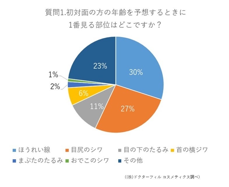 初対面で年齢を予想するときに1番見る部位について質問したところ、もっとも多かった回答は「ほうれい線(30%)」。次に「目尻のシワ(27%)」。半数を超える57%の人が目もとや口もとを見て年齢を予想していることが分かりました。
