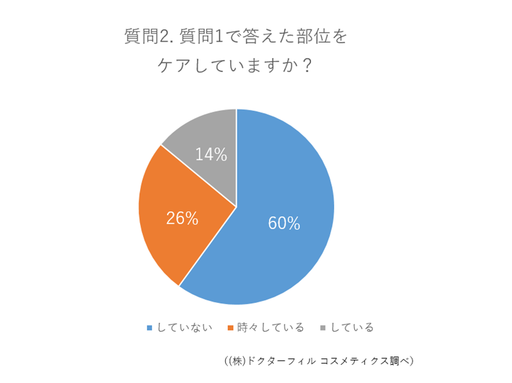質問1で答えた部位を自身がケアしているか質問したところ、「ケアをしていない」と答えた人が60%と、半数を超える結果となりました。