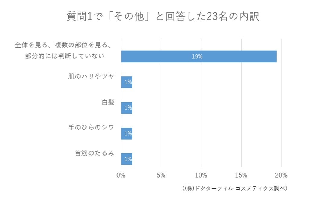 一方、3番目に多かった「その他(23%)」の回答を見ると「全体を見る、複数の部位を見る、部分的には判断していない」と答えた人が19%と最も多く、特定の部位だけでなく全体的なバランスで見た目年齢を予想している人が一定数いることが分かりました。