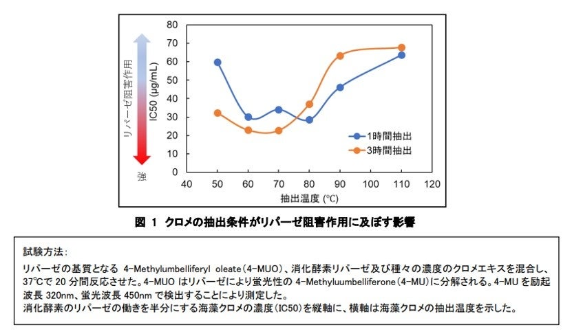 海藻クロメの水抽出物は、リパーゼ阻害作用を有することが確認されました。また、リパーゼ阻害作用が強くなる海藻クロメの抽出温度および時間が確認されました(図1)。1及び3時間抽出いずれにおいても、60~80℃の抽出温度でリパーゼ阻害作用が強くなりました。