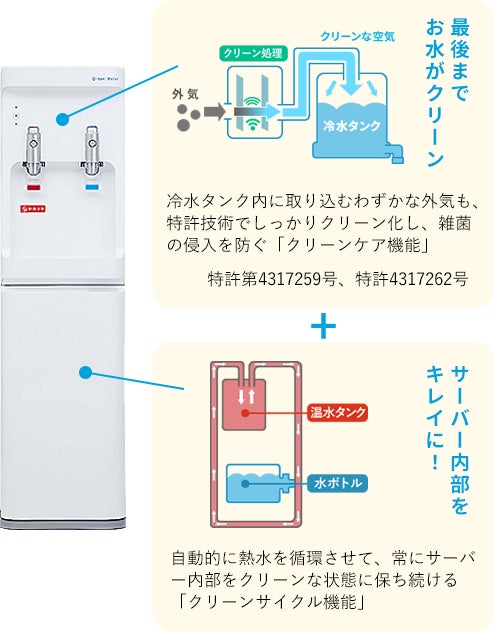 特徴③ Wクリーン機能でウォーターサーバー内部を常にクリーンな状態に保つWクリーン機能を搭載。 天然水の「鮮度」を守り続けるので、最後の一滴まで汲みたてのおいしさが続きます。