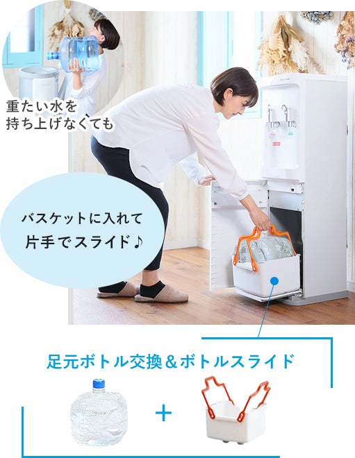 特徴② 重たい水ボトルを持ち上げずに、足元でかんたんにボトル交換方式。 主婦の方には馴染み深い買い物かごをヒントに、天然水ボトルを片手で簡単に持ちやすく、正確にセットできるように改良を重ね開発した「ボトルスライド」方式です。