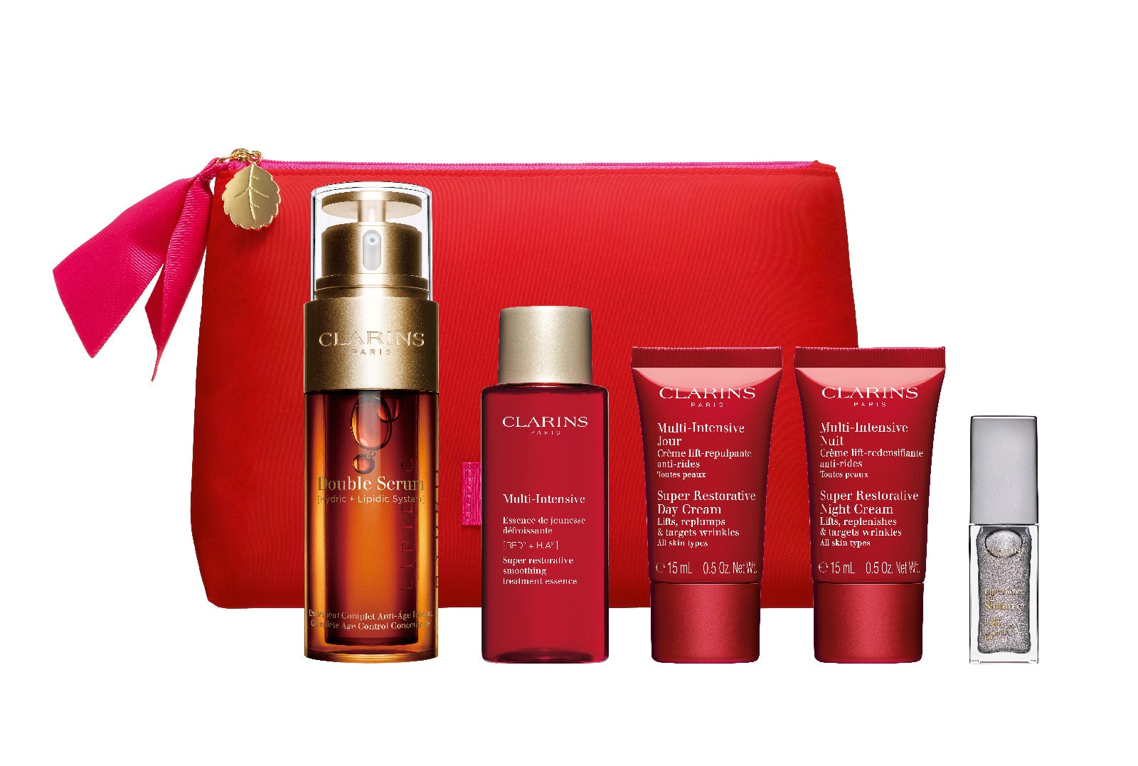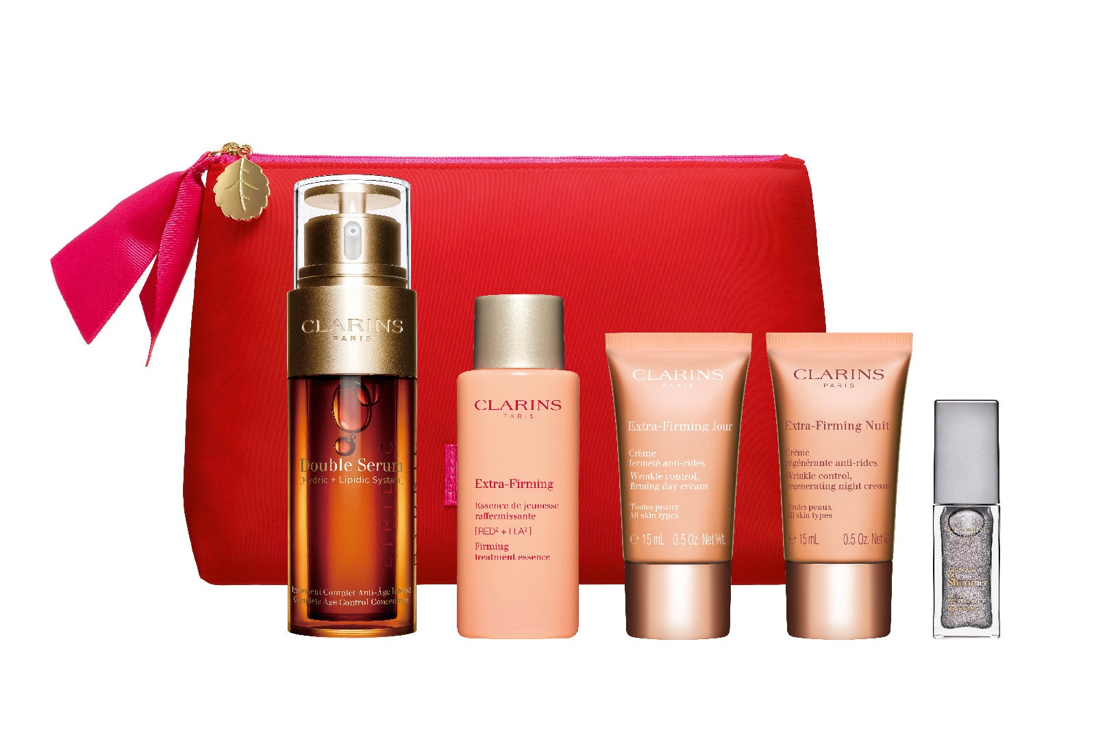 クラランスを代表する美容液「ダブル セーラム EX」とスープララインでハリを引き寄せ、輝きを引き上げるキット。