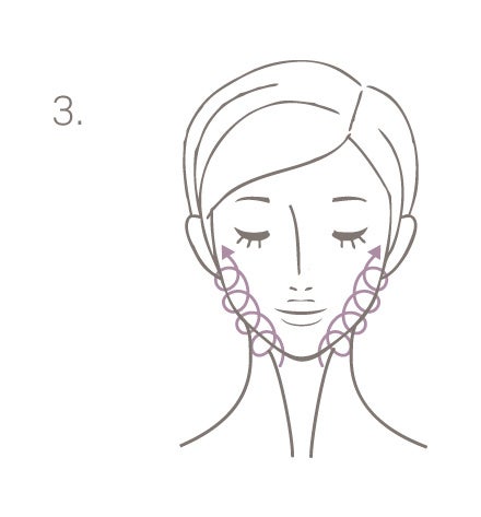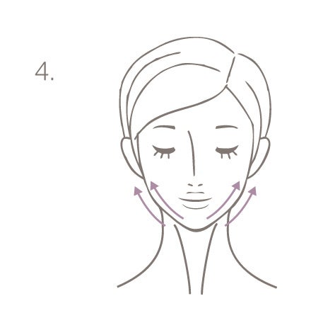 3. EXオイルセラム5滴を手に取り、首と顔全体によく馴染ませた後、口角の両脇から、顎関節までの間の頬骨の下を指でよくほぐします。
