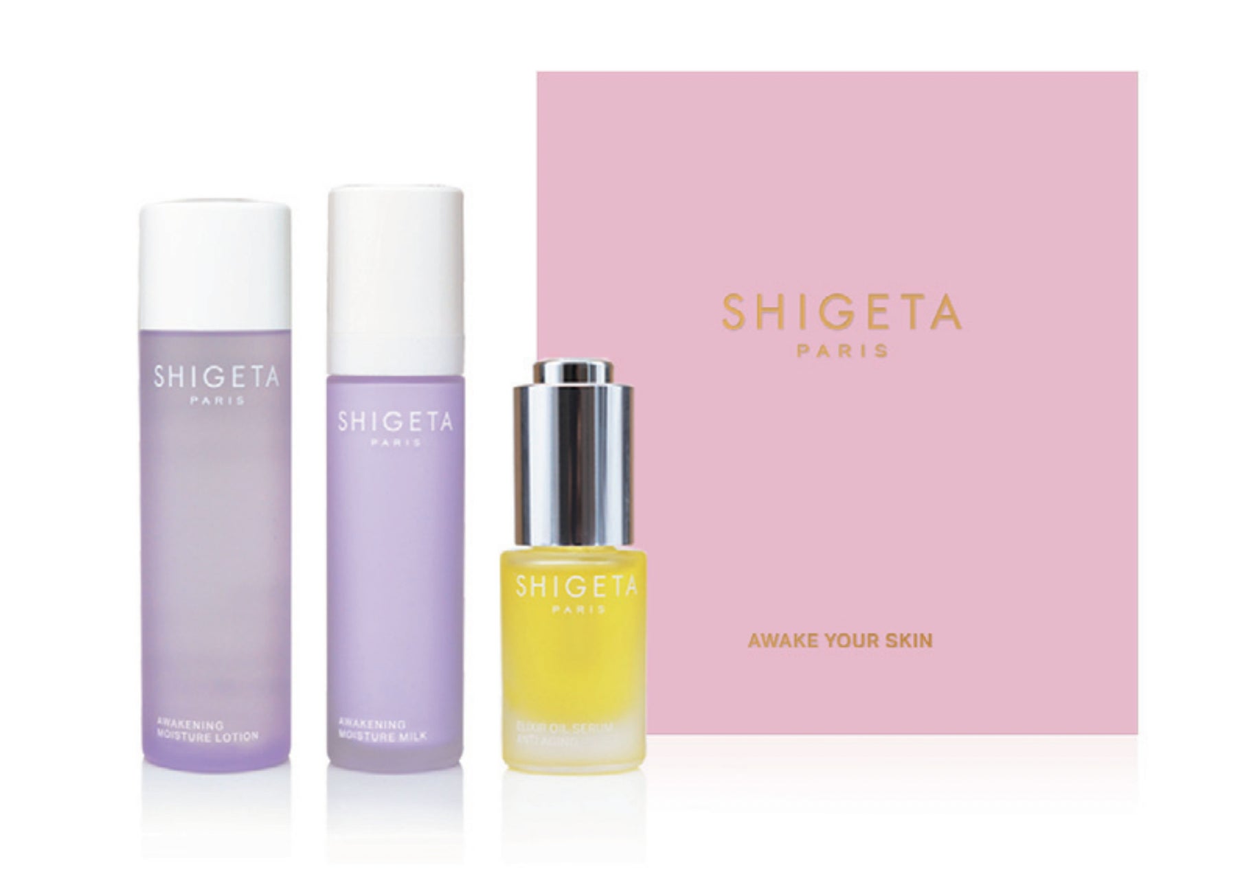凛とした透明感のあるお肌に導くスキンケアライン「アウェイクニングシリーズ」から、少量でもしっかりお肌にうるおいを与える「AWモイスチャーローション」と、乾燥しがちな肌をすみずみまでうるおし、キメの整ったハリ美肌に導く「AW モイスチャーミルク」の2アイテムと、お肌にハリとうるおいをもたらすSHIGETA PARISのベストセラーアイテム「EX オイルセラム」をセレクトしました。冬の乾燥に負けない、豊かなハリと透明感のあるツヤ肌を叶えます。