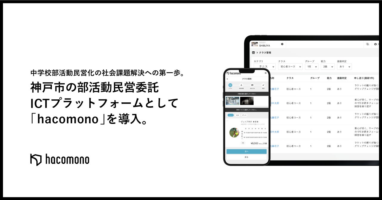 「ウェルネス産業を、新次元へ。」をミッションに会員管理・予約・決済・POSシステム「hacomono」を提供する株式会社hacomono(東京都渋谷区:代表取締役 蓮田 健一)は、関西を中心に、全18テニス施設・スクール事業所を運営する株式会社ITC(本社:兵庫県神戸市長田区、代表取締役:諏澤誠治)が実施する「令和4年度神戸市における地域運動部活動推進事業」のシステム支援として、「hacomono」を導入したことをお知らせいたします。