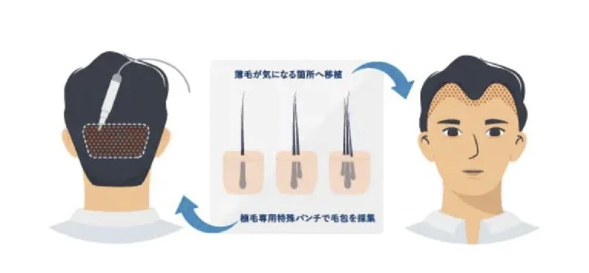 極細の特殊なFUE専用パンチで仕上がりを想定した必要数のみのグラフト(株)を1つずつ丁寧に採取し、頭部全体のバランスや毛流れ、癖を考慮しつつ一本一本正確に移植するため、ナチュラルで美しい仕上がりと術後の痛みが軽いのが特徴です。