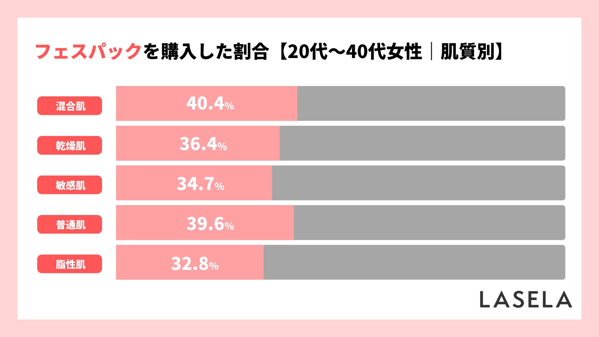 購入者を肌質別に分けてみたところ、最も購入割合が高かったのは「混合肌(40.4%)」、最も低かったのは「脂性肌(32.8%)」で、全体平均36.8%となりました。フェイスパックの購入率は肌質によって大きな差はないようです。