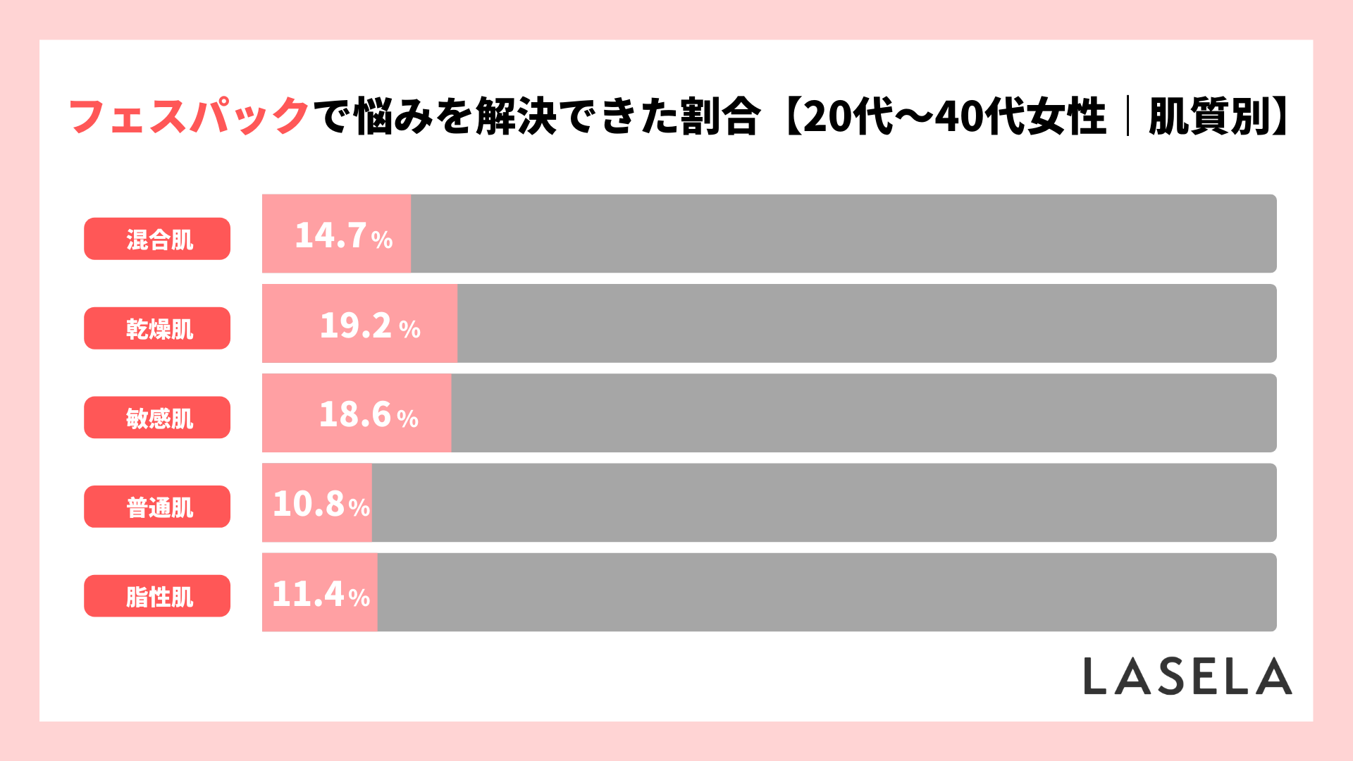 フェイスパックで悩みを解決できた割合を肌質別に比較したところ、解決できた人が最も多かったのは「乾燥肌(19.2%)」でした。続いて「敏感肌(18.6%)」、「混合肌(14.7%)」の順となりました。