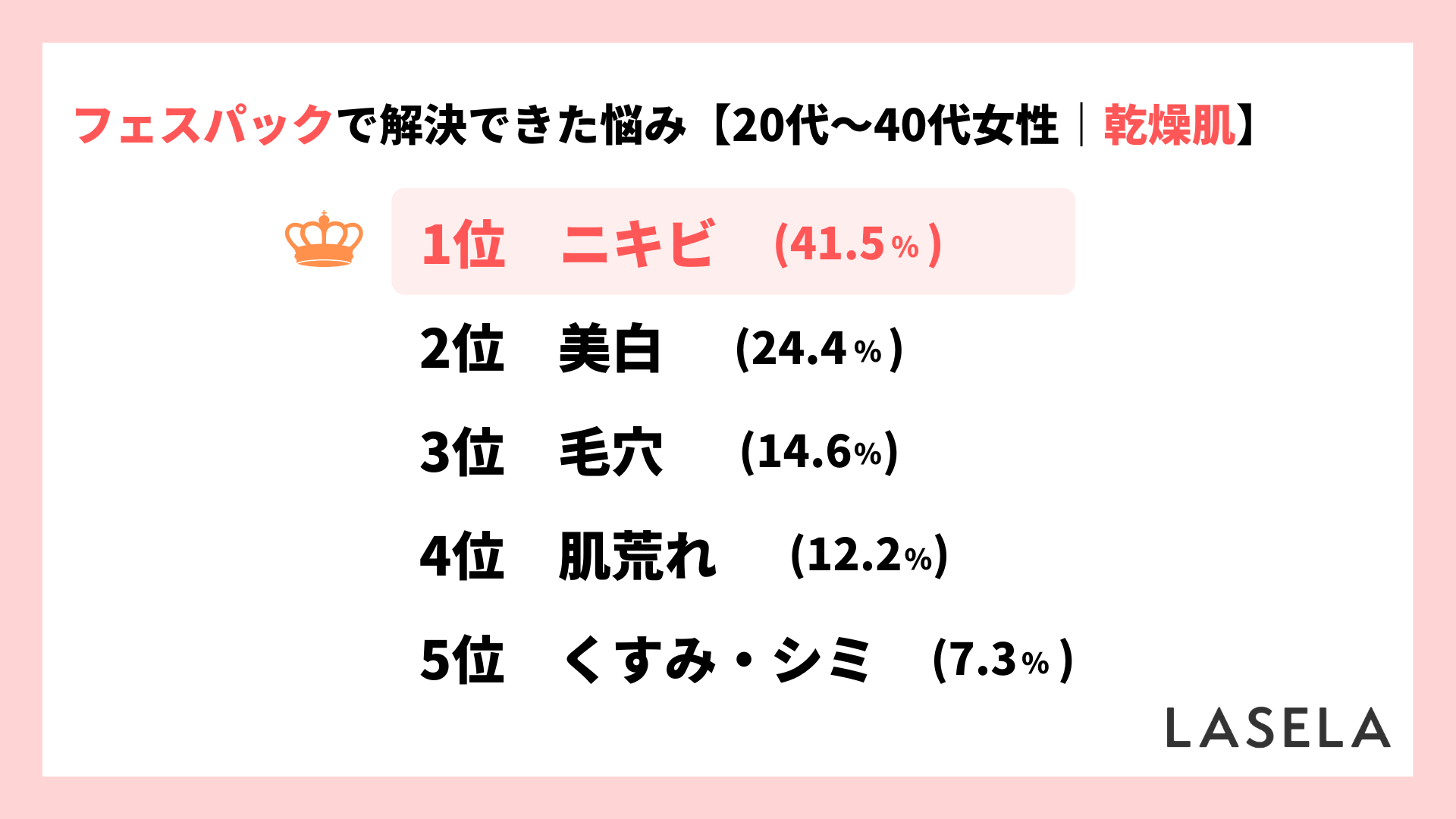 フェイスパックで悩みを解決できた乾燥肌の人に、どんな悩みを解決できたのかたずねた結果、最も多かったのは「ニキビ」で41.5%でした。