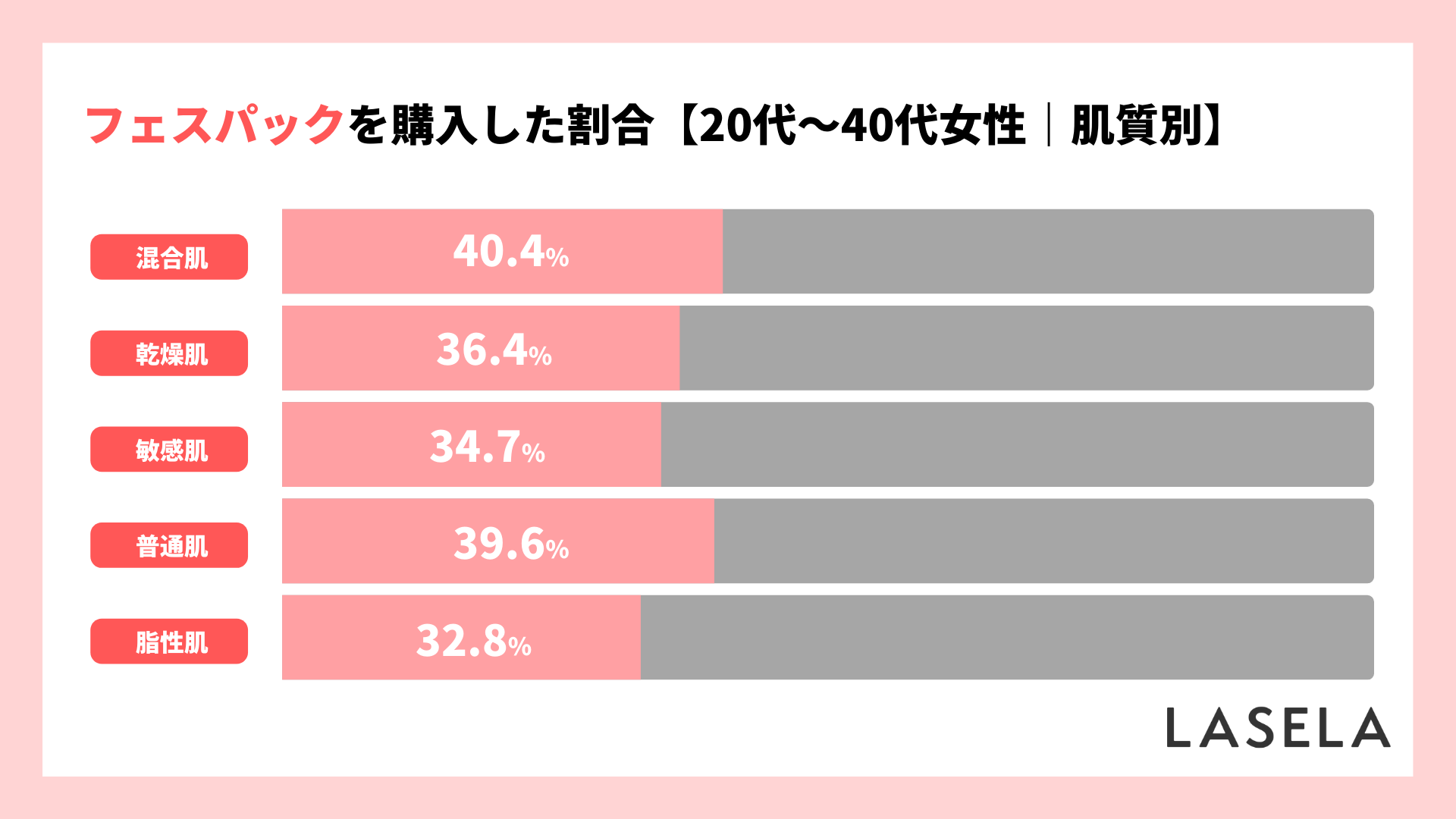 購入者を肌質別に分けてみたところ、最も購入割合が高かったのは「混合肌(40.4%)」、最も低かったのは「脂性肌(32.8%)」で、全体平均36.8%となりました。フェイスパックの購入率は肌質によって大きな差はないようです。