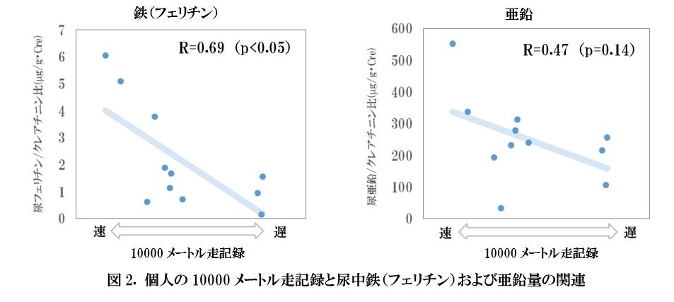また10000メートル走の自己ベスト記録上位11人において、記録と尿中栄養素の関連性を調査しました。その結果、10000メートル走記録が速い選手では尿中の鉄(フェリチン)と亜鉛の量が多い傾向にあること、さらに尿中の鉄(フェリチン)の量は、10000メートル走記録と有意に相関することが分かりました(図2)。これらの結果は、体内の栄養状態が競技パフォーマンスと関連することを示唆しています。