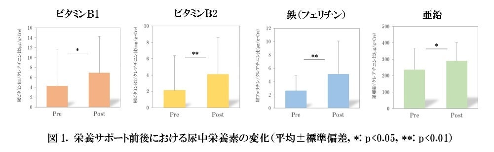 栄養サポートをした後、尿中のビタミンB1、ビタミンB2、鉄(フェリチン)、亜鉛量は、有意に増加していることが分かりました(図1)。従来の研究で、各栄養素の尿中排泄量が体内での充足状態を反映していることを当社では確認しています。つまりこの結果から、選手にとって不足している栄養素をサプリメントとして補うことで、体内の栄養バランスが改善することが示唆されました。
