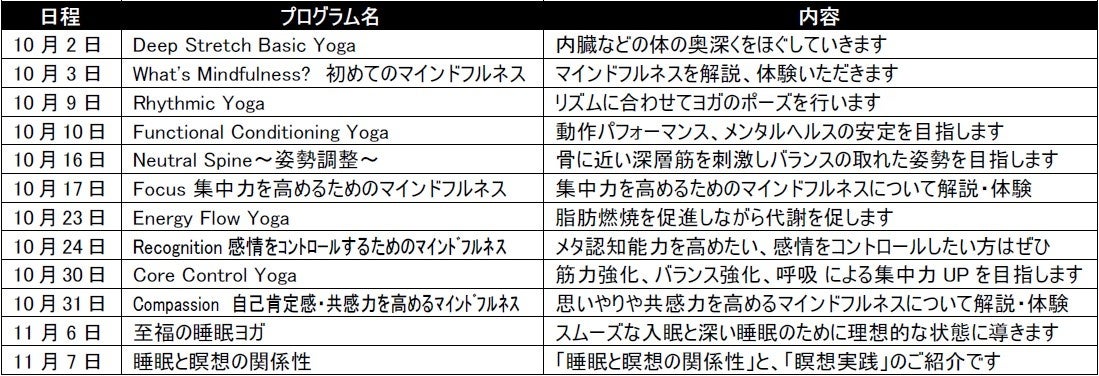 | フィットネスヨガに加えて、“マインドフルネス”や睡眠の質を向上させるプログラムも初登場 |