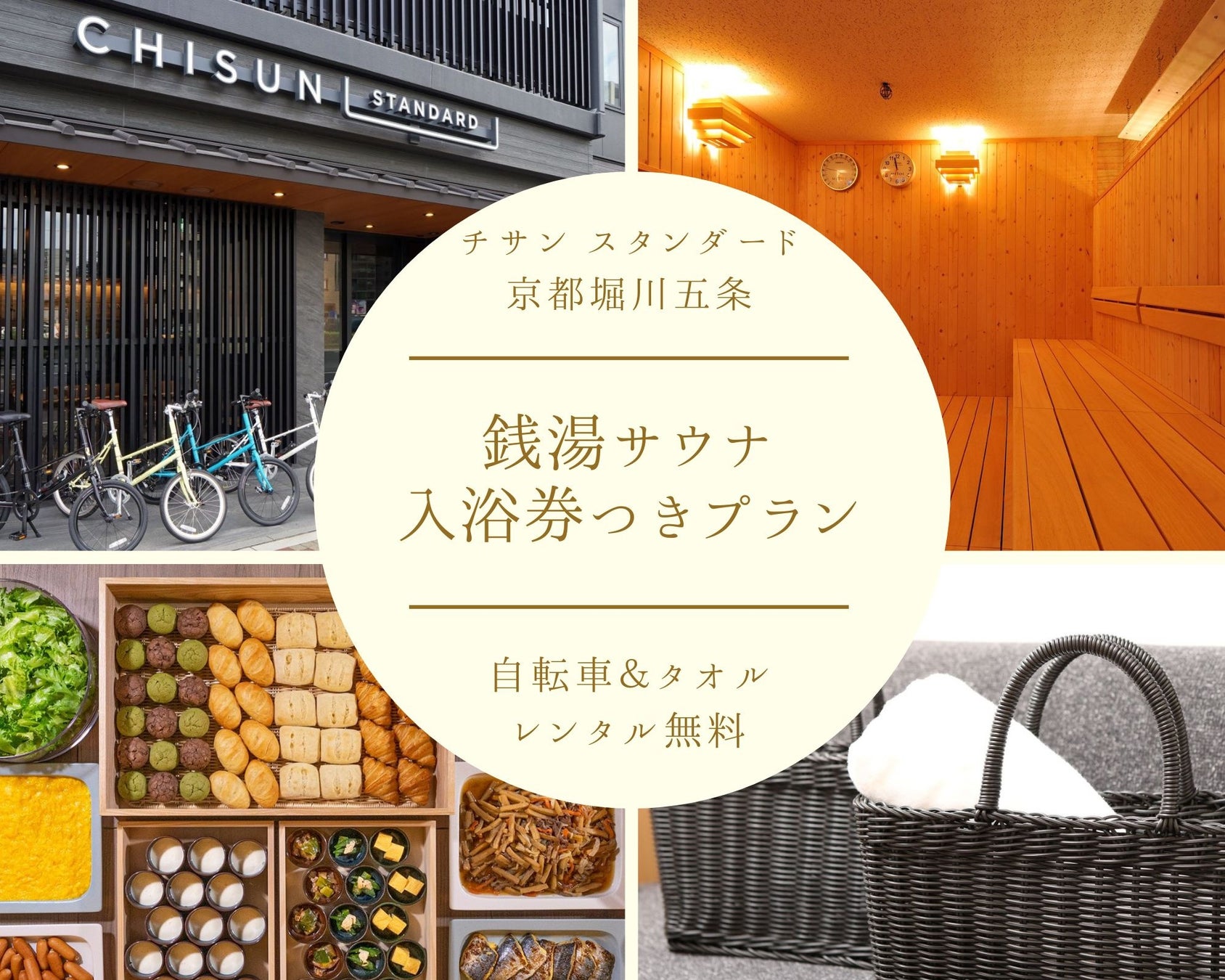 『チサン スタンダード 京都堀川五条』は無料のレンタサイクルと、おいしいごはんのお供が充実した和洋ビュッフェ形式の朝食が人気のホテルです。場所は、京都市営地下鉄「五条」駅2番出口徒歩13分、京都市営バス停留所「堀川五条」徒歩 1 分に位置し、ホテルの周辺には魅力的な銭湯やサウナが多くあるのも魅力の1つです。そこで、『チサン スタンダード 京都堀川五条』を拠点にした“ととのえ旅”をお得に楽しんでいただきたく、銭湯入浴券つきプランをご用意しました。