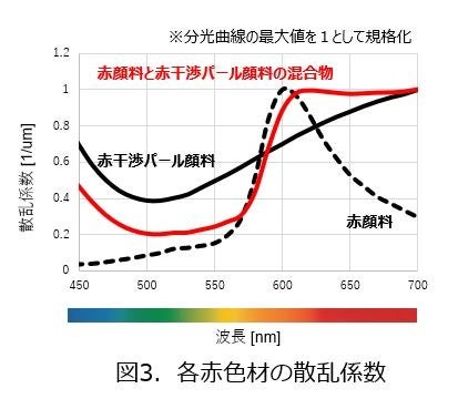 また、シャボン玉がさまざまな色みに見えるのと同様の現象(光の干渉)により、赤色に発色する赤干渉パール顔料もよく知られた赤色材です。赤干渉パ―ル顔料の散乱係数は、赤色領域で高いまま維持するものの、緑色領域付近から増大していきます(図3・黒実線)。つまり赤色領域の散乱のみを増大することはできず、“白っぽい赤”の発色に見えます。