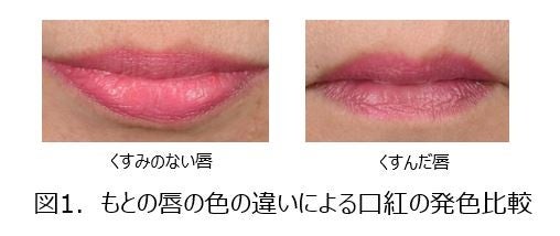 花王は、唇の色はさまざまであることに着目し、日本人の見た目の唇の色が「赤く鮮やか」「赤みがない」「彩度が低い」「暗い」という特徴を有する4つのグループに分けられることを報告しています※1。改めて調べると、特に彩度と明度の低いくすんだ唇は、口紅の発色もくすんだ仕上がりになることがわかりました(図1・右)。口紅の塗膜は半透明なので、唇の色の影響を受けてしまうのです。