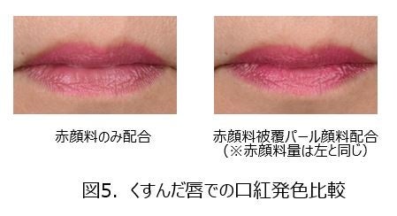 この色材を配合した口紅を塗布すると、くすんだ唇でも鮮やかな発色が確認できました(図5)。