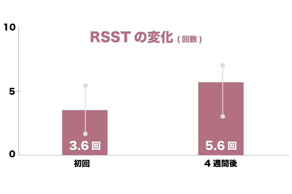 「舌骨上筋への10分間電気刺激」の実践にて、介入を 実施した全ての方で初回と4週間目のRSSTの回数の差は有意に向上し嚥下機能の向上が認められ、短時間の 電気刺激により嚥下機能の改善が図れることが実証されました。