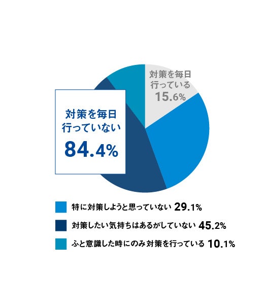 具体的な対策を毎日行っている人は約15%、対策をしたい気持ちはあるが対策を実施していない人は約44%。