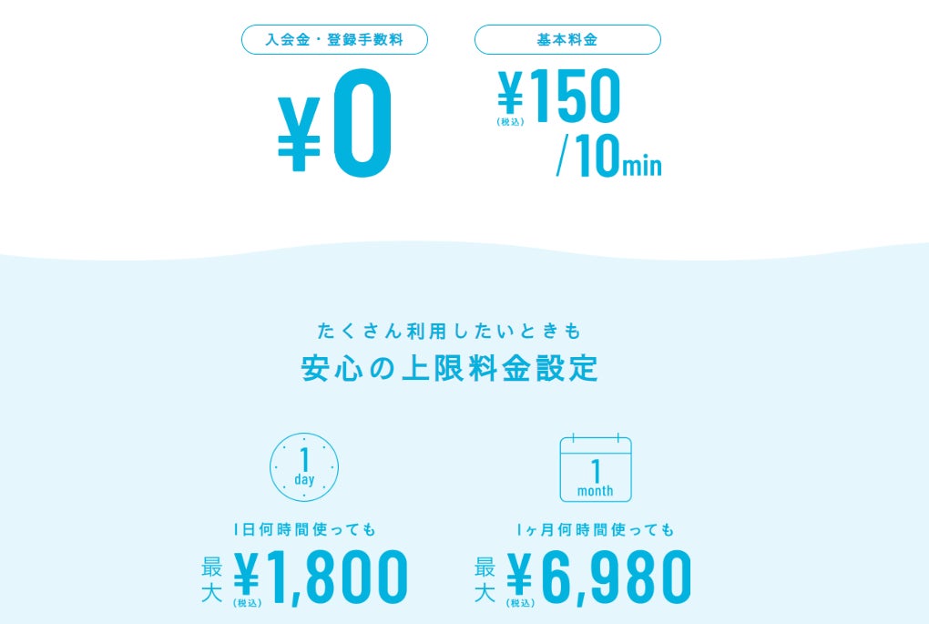 PORTでは、10分150円、1日最大1,800円、1ヵ月どれだけ使っても最大6,980円という、「使った分だけお支払い」いただくタイムチャージ制(時間制料金)を採用しています。