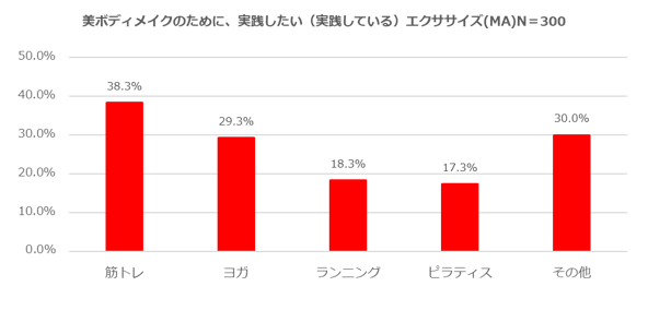 美ボディメイクのために実践したいエクササイズを聞いたところ、「筋トレ(38.3%)」が最も多い回答となり、次いで「ヨガ(29.3%)」、「ランニング(18.3%)」という結果になりました。また美容のための投資先として「筋トレを中心としたトレーニングジム(29.3%)」が第1位となり、「高級な基礎化粧品(14.0%)」、「美容サプリ(12.7%)」の約2倍の支持となりました。「筋トレ」を「美容」のツールのひとつとして、お金をかけて取り組みたいと考えている女性が多くいることがうかがえる結果となりました。