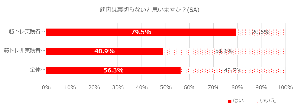 筋トレ実践者の79.5%が「筋肉は裏切らない!」と回答。男性イメージが強い「筋トレ」ですが、女性にとっても、強い心のよりどころとなっているようです。