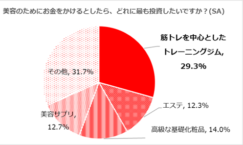 ・『美容』目的の投資先として、「筋トレジム(29.3%)」で第1位。次いで「高級な基礎化粧品(14.0%)」、「美容サプリ(12.7%)」 という結果に!