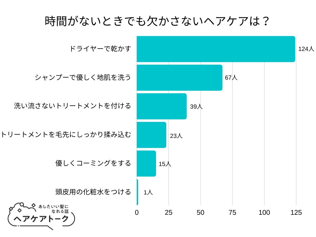 「時間がないときでも欠かさないヘアケアは?」とアンケート調査した結果、1位は『ドライヤーで乾かす』でした。
