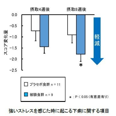 消化管症状を評価する質問票「出雲スケール*4」の結果を基に、強いストレスを感じた時に起こる下痢に悩んでいた被験者 (20名) について解析した結果、被験食を摂取した被験者は、「出雲スケール」の“強いストレスを感じた時に起こる下痢で困ったこと”に関する項目が、摂取8週目においてプラセボ食を摂取した被験者に対して有意に改善していました。なお、この成果については「薬理と治療 (2019年第47巻第11号、1883-1990)」に論文が掲載されました。