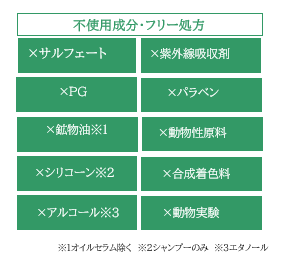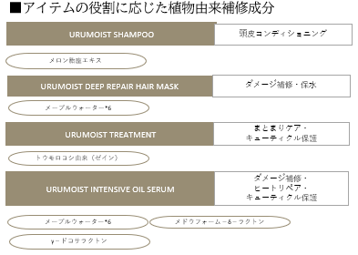 *うるおいを与え保つこと *1アルガニアスピノサ核油、オリーブ果実油、ホホバ種子油、シア脂、ワサビノキ種子油(すべて保湿成分) *2加水分解ダイズタンパク、加水分解エンドウタンパク、ジラウロイルグルタミン酸リシンNa、セラミドAP、セラミドNG、セラミドNP、セラミドEOP、ヒマワリ種子エキス、ユズ果実エキス(すべて補修成分) *3加水分解エンドウタンパク(補修成分) *4加水分解ダイズタンパク(補修成分) *5ヒマワリ種子エキス、ユズ果実エキス(すべて補修成分) *6サトウカエデ樹液 *7 シャンプー:*1、*2、メロン胎座エキス、水添レシチン、フィトステロールズの複合成分、トリートメント:*1、*2、ゼイン、水添レシチン、フィトステロールズの複合成分、ディープリペアヘアマスク: *1、*2、サトウカエデ樹液、シロキクラゲ多糖体、水添レシチン、フィトステロールズの複合成分、インテンシブオイルセラム:*1、*2、サトウカエデ樹液、メドウフォーム-δ-ラクトン、γ-ドコサラクトン、水添レシチン、フィトステロールズの複合成分