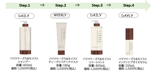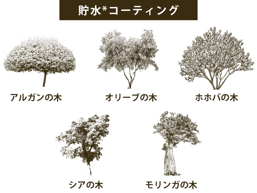 byTREESには厳選された5つの樹木オイル*1がすべてのアイテムに共通配合。その5つの樹木オイル*1が髪を保水コートし保護することで、乾燥や摩擦など外的ダメージを防ぎます。