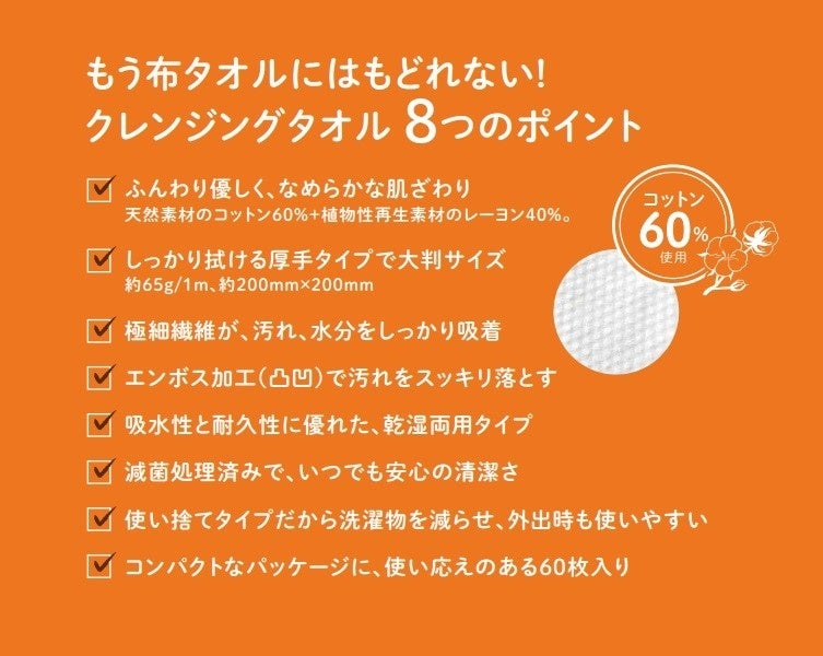 また、しっかり厚手で、約200mm×200mmの大判サイズ、極細繊維が肌につきにくく、エンボス加工で汚れをしっかり吸着します。旅行やキャンプなどの外出時にも便利な使い捨てタイプのため、60枚入りでも軽量でかさばりません。