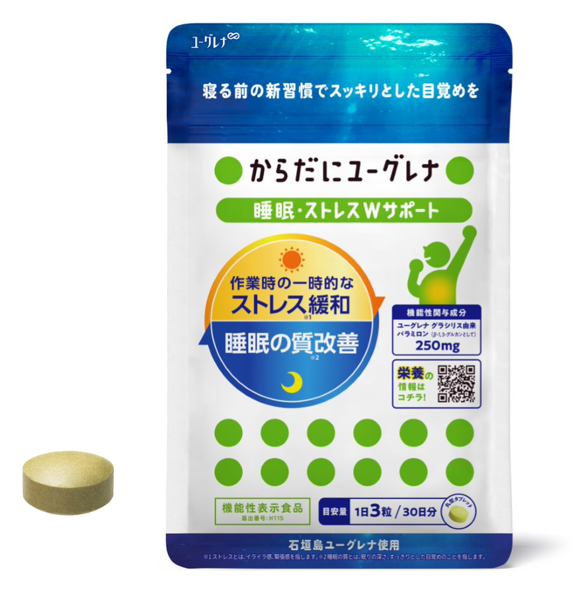こうした背景を踏まえて、当社は、ユーグレナグラシリス由来パラミロン(β-1,3-グルカンとして)を機能性関与成分として、睡眠の質の悩みの原因となりうる「イライラ感や緊張感といったストレス」を緩和することが報告されている機能、そして「眠りの深さ、すっきりとした目覚め」といった睡眠の質を改善することが報告されている機能を2つ併せ持ったダブル機能性の商品を開発しました。
