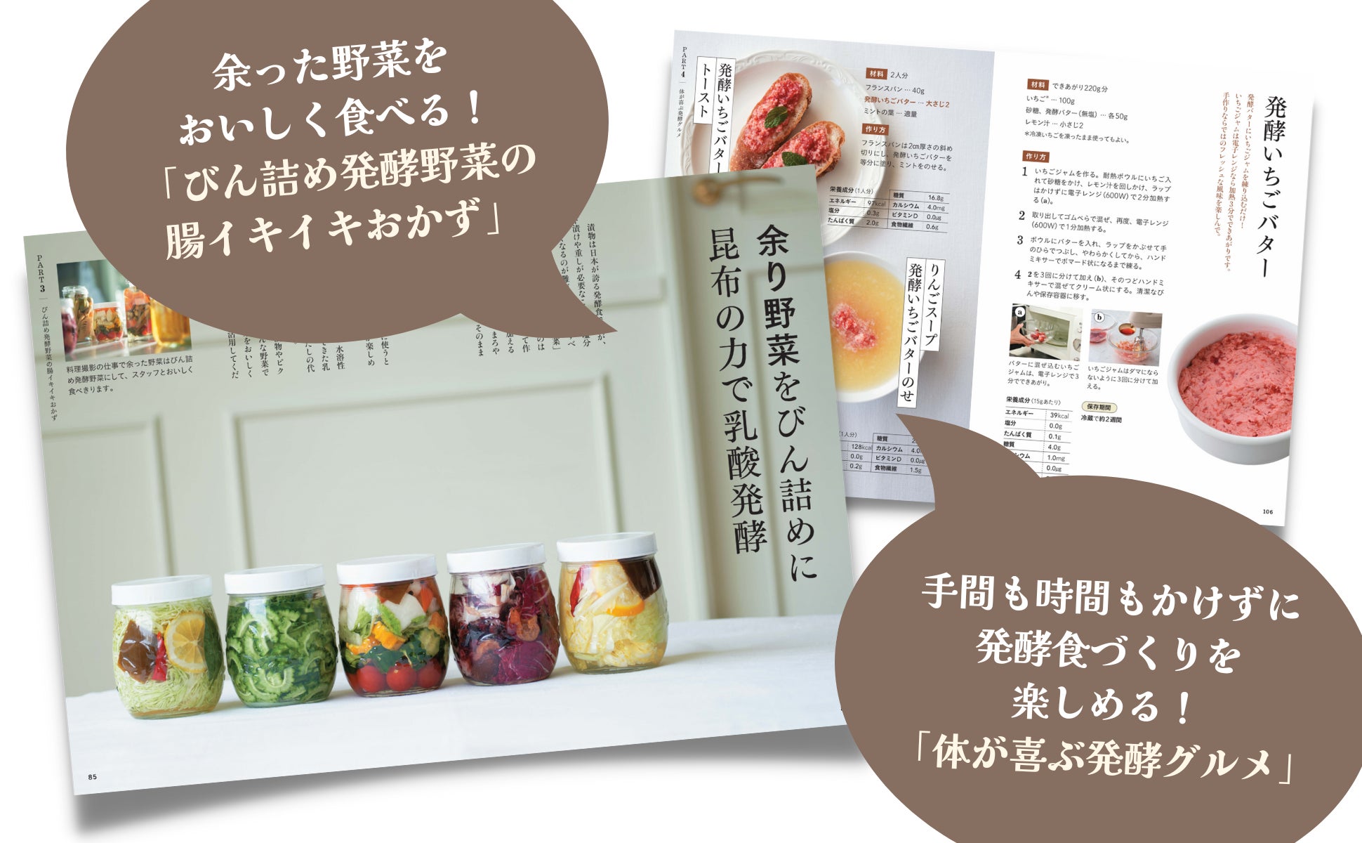 本書の第3章では、余り野菜をびん詰めにし、昆布の力で乳酸発酵した「びん詰め発酵野菜」を紹介。そのまま食べるのはもちろん、料理に使うと生野菜とはひと味違うコクが楽しめます。手間も時間もかけずに発酵食づくりを楽しみたい人におすすめなのは、第4章の「体が喜ぶ発酵グルメ」。簡単に作れるだけでなく、アレンジの幅も広がります。