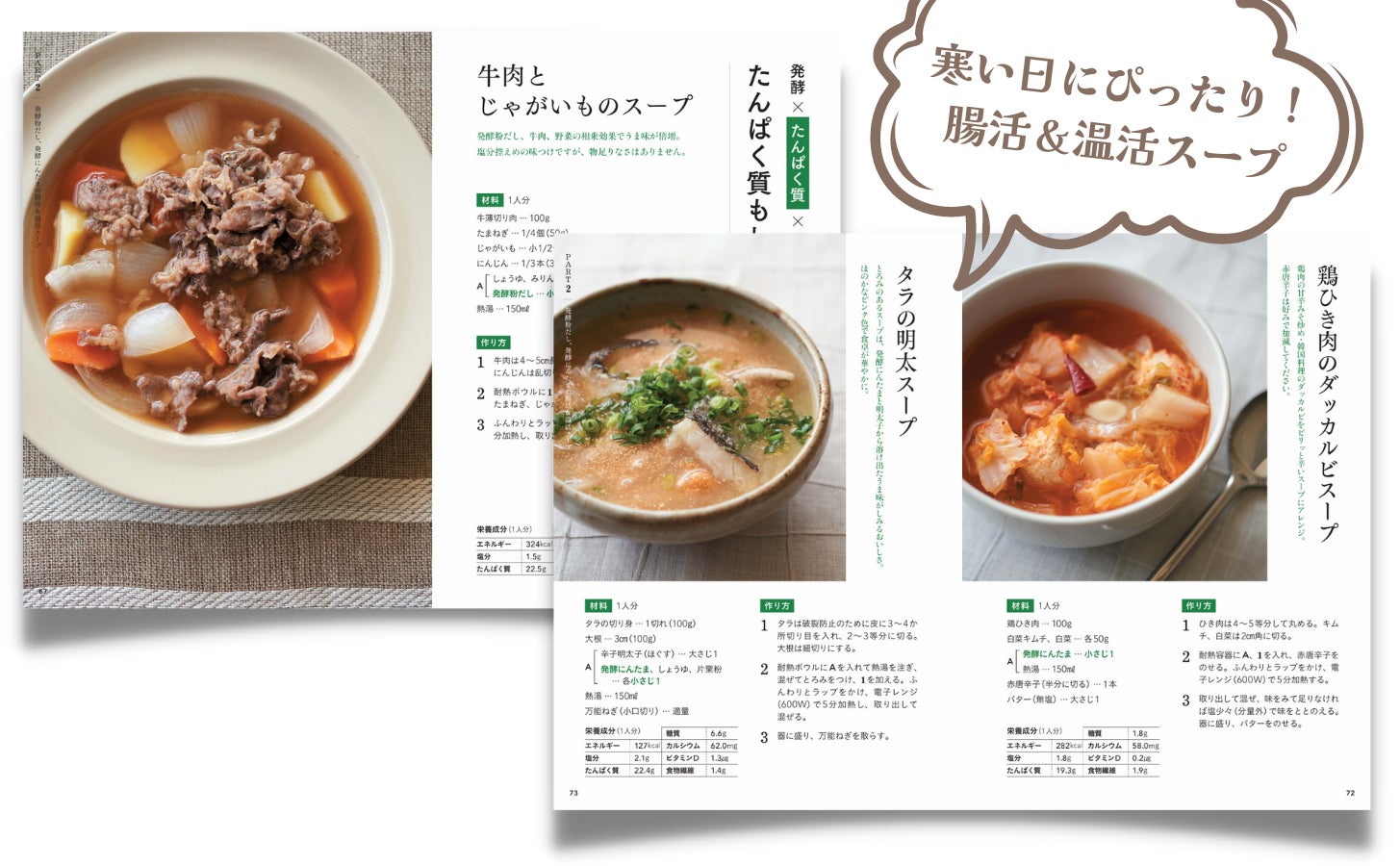 「体温が1℃上がると免疫力は5~6倍になる」と言われます。日々の食事で実践できる腸活&温活のひとつが、温かいスープや汁物を取り入れること。本書で紹介する「発酵粉だし」&「発酵にんたま」は、発酵パワーが取り入れられ、気になる塩分も大幅にカットできる”自家製だしの素”です。免疫力アップだけでなく、疲労回復、エネルギー代謝アップ、高血圧や血糖値の改善、美肌効果、アンチエイジング効果など、様々な効果が期待できる食材と組み合わせることで健康増進を図ります。たんぱく質や食物繊維もたっぷり、しっかり摂れるレシピを紹介します。