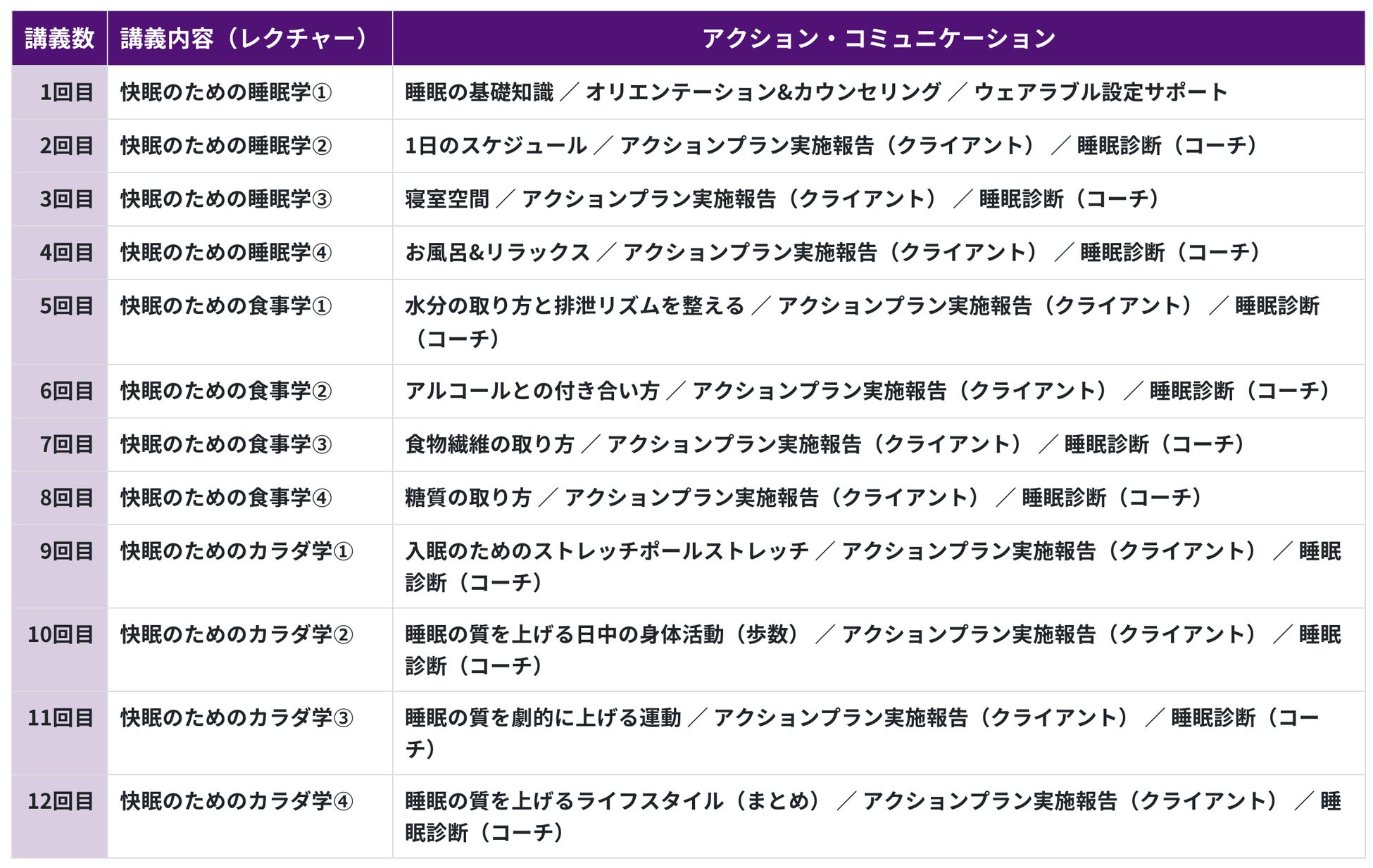 以下のようなカリキュラム(全12回の講義/3ヶ月)にて睡眠に対する正しいアプローチの仕方を学習していきます。睡眠の質の低下の理由を自ら知ることで、どのように自分が行動すればいいかということが明確になります。これにより、何か物(サプリメント、ドリンクなど)に頼ることなく、自分の身体をコントロールできるようになります。