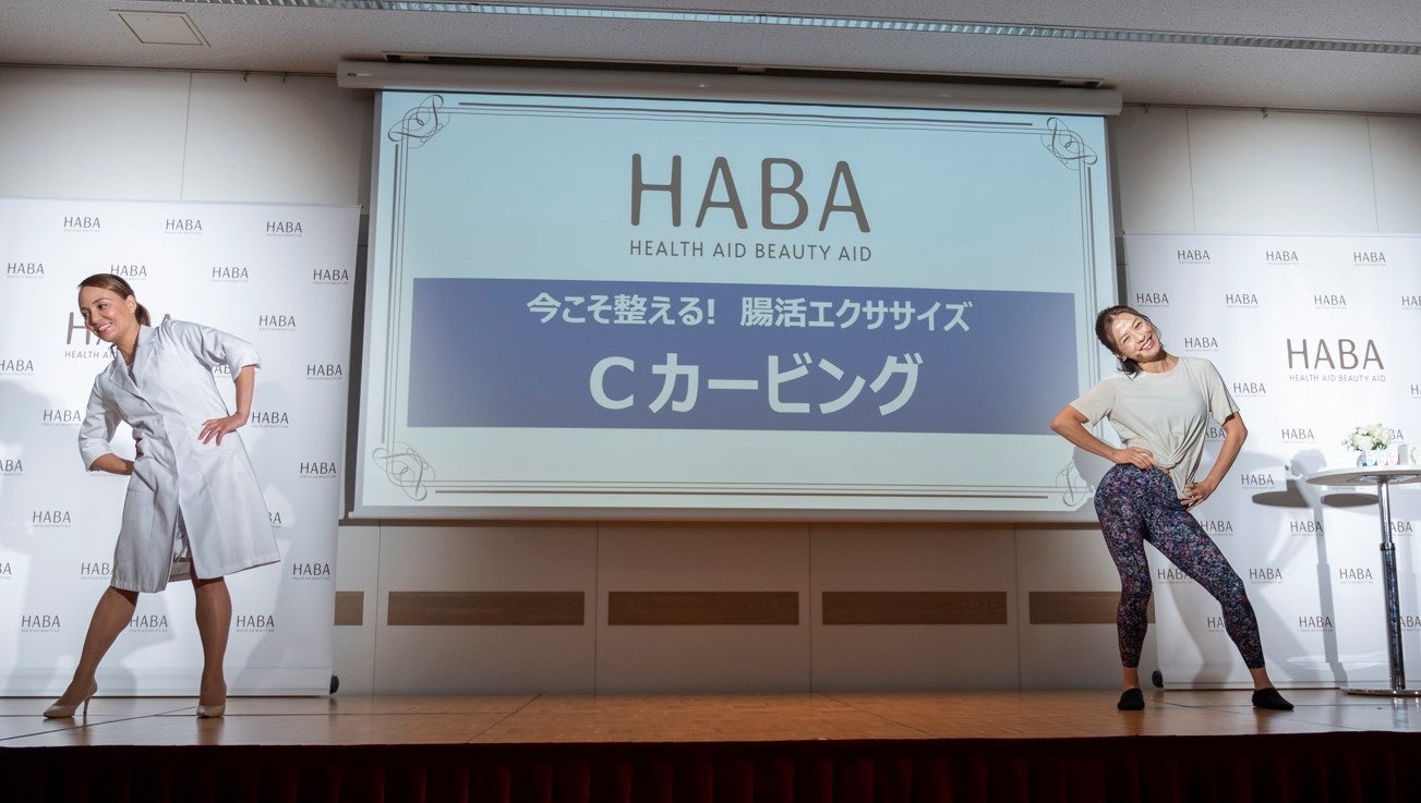美と健康を助けるハーバー公式YouTubeチャンネル「HABA Beauty+(ハーバービューティ プラス)」で活躍するビューティアンバサダーでエクササイズトレーナーの森 奈央子さんによる、今日から実践できるカンタン腸活エクササイズを行いました。石原 新菜先生や、来場のメディアの方々も一緒に身体を動かし、大変盛り上がりました。