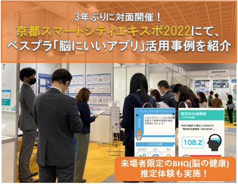 株式会社ベスプラ(東京都渋谷区、代表取締役CEO:遠山 陽介、以下:べスプラ)が提供するスマートフォンアプリ「脳にいいアプリ」を用いた事例が2022年10月6日(木)から7日(金)までけいはんなオープンイノベーションセンターで開催の「京都スマートシティエキスポ2022」でのBHQプロジェクトブースにて紹介されました。