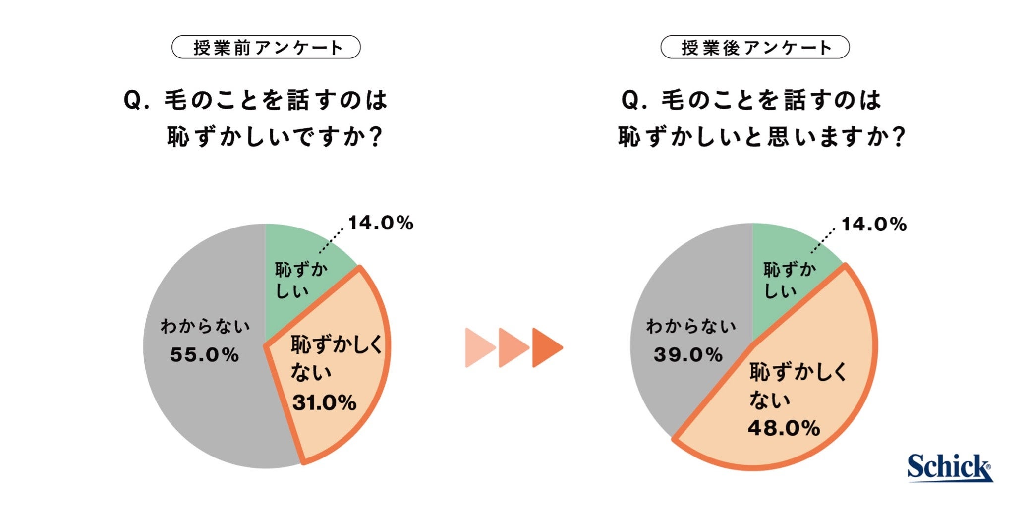 「MY FIRST SHAVE」の授業を行なった渋谷区立加計塚小学校の4年生児童44名に対して、授業前と授業後に体毛に関するアンケートを実施しました。授業前後の児童の意見から、正しい体毛の知識やケア方法を伝えた出張授業の成果としてポジティブな結果が浮かび上がりました。