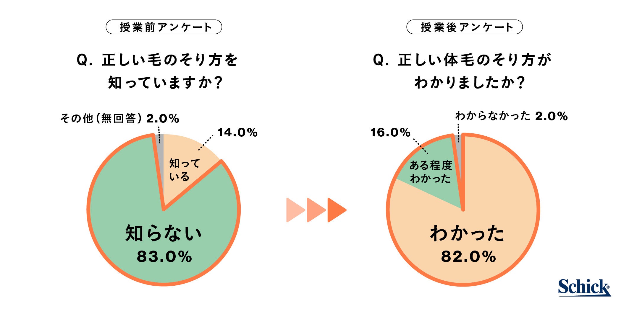 - 授業後は、体毛の正しいそり方がわかったと答える児童の割合は84ポイントもアップ