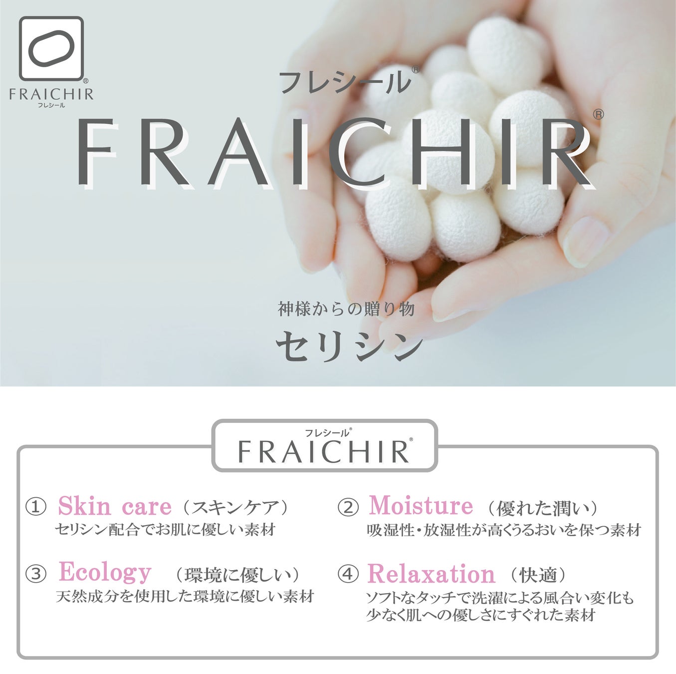 FRAICHIR®(フレシール)は、繭糸を構成する天然たんぱく質「セリシン」を繊維に定着させる加工技術です。繊維にシルクの持つ特性「吸・放湿性」「制電性」「肌へのやさしさ」を付与します。フェムテック分野で性の肌への刺激を軽減する素材として期待されている商品です