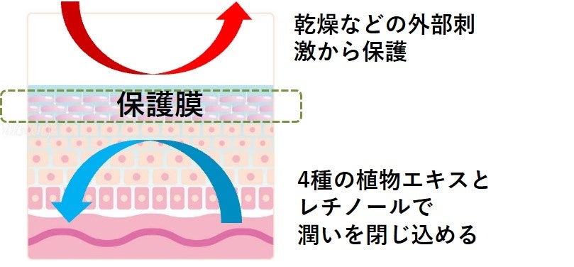 塗布後、3次元構造の保湿膜を肌表面に形成。美容成分やうるおいを封じ込め、同時に乾燥などの外部刺激から肌を長時間守ります。この保護膜は水を弾く性質があるため、アルコール消毒などによる角層の水分蒸発を抑え、肌のうるおいを逃しません。